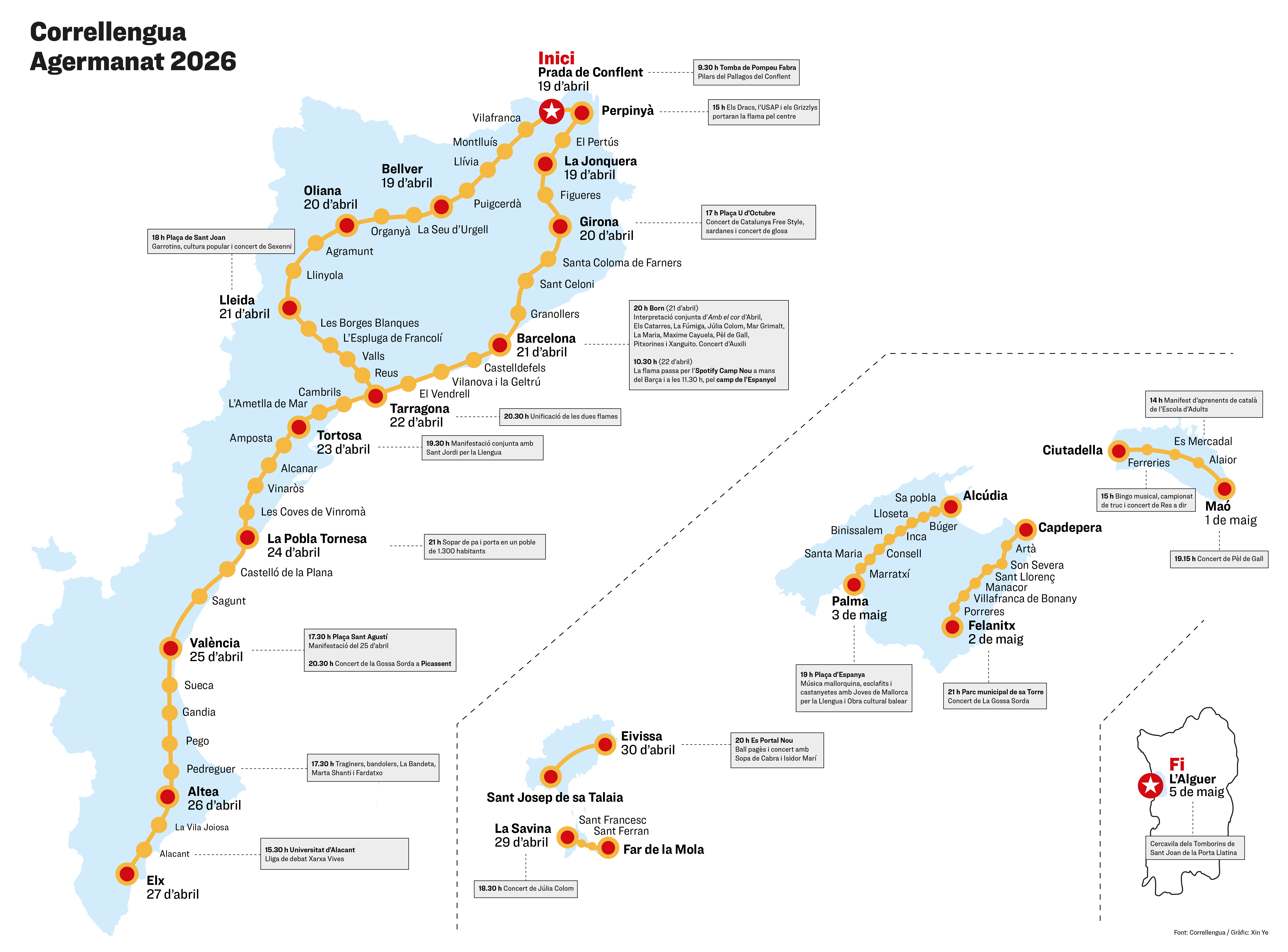 The Correllengua Agermanat is a relay race that will take place from April 19 to May 5. Volunteer runners will pass the torch between 8 in the morning and 8 in the evening over 1,500 kilometers during 19 stages and 16 days. The start will be in Prada de Conflent, at Pompeu Fabra's tomb, and the route will be initiated by the Mallorcan inventors of the Correllengua. Afterward, the flame will bifurcate towards Lleida and Girona and reunite in Tarragona.The logistics of the Correllengua have been complex, as permits are required that affect traffic on all types of roads, necessitating agreement among mossos, gendarmes, carabinieri, civil guards, and urban guards. Runners can sign up through the website and for segments, which are a maximum of 500 meters. So far, over 5,000 registrations have been received.The youth of the organizers is evident in their communication codes and their references. They have grown up through social media and also through face-to-face interaction, organizing up to 80 events in Catalan-speaking territories without significant institutional or media support. An example is the Correllengua song, Amb el cor, performed by about twenty bands and artists, including Els Catarres, Adrià Salas, Fades, Júlia Colom, La Gossa Sorda, La Fúmiga, Doctor Prats, la Dharma, and Franca Masu. "With a clog and a espadrille, we have done things comparable to people with resources," celebrates Guillem Lloret. "It's just that people want to do things," states Muñoz.In each town the flame passes through, a festive event will be held (a concert, a talk, a game, an activity), which each municipality is responsible for organizing and publicizing on social media. The Correllengua organizers will do so in the main capitals of the territories, where the flame will reach crowded squares. Among other events, La Gossa Sorda will perform in Picassent and Felanitx. In Barcelona, Auxili will perform. In Perpignan, USAP will carry the Flama, but in Barcelona, both Barça and Espanyol will also do so. In Lleida, Sexenni will perform and garrotins will be recited. In Tortosa, the Correllengua flame coincides with one of the Sant Jordi per la Llengua demonstrations. In Formentera, Júlia Colom will perform, and in Ibiza, they will perform the ball de pagès and a concert with Sopa de Cabra and Isidor Marí. And in L'Alguer, there will be a parade by the Tamborins de Sant Joan.
