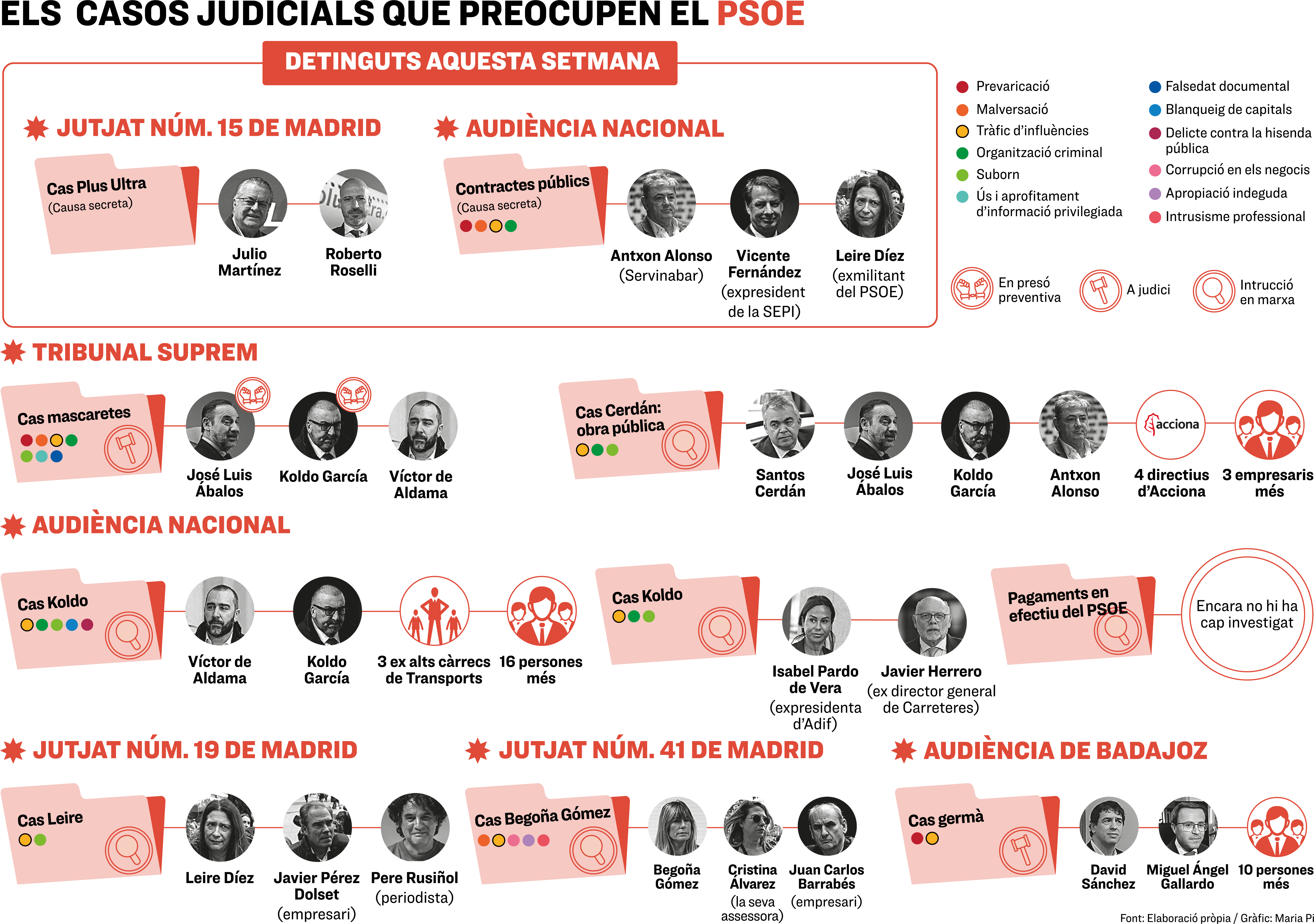 MadridPedro Sánchez's government is increasingly dependent on the courts. Anxiety is spreading among the Socialist ranks, especially after a week that has brought two new developments: five arrests These events have brought to light two new cases—which remain secret—and a Civil Guard report that once again implicates José Luis Ábalos. These are ongoing investigations into issues that strike at the heart of the Spanish president's political roadmap and the origins of his rise to power. Of the five arrested, the National Court has released former Socialist Party member Leire Díez, Vicente Fernández Guerrero, former president of SEPI (State Holding Company for Industrial Participations), and Basque businessman Antxon Alonso, owner of the company Servinabar and a friend of Santos Cerdán, former PSOE (Spanish Socialist Workers' Party) organizational secretary. All five were released with precautionary measures (passport confiscation and periodic court appearances) after the prosecution did not request their imprisonment.