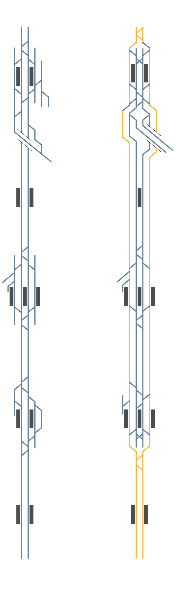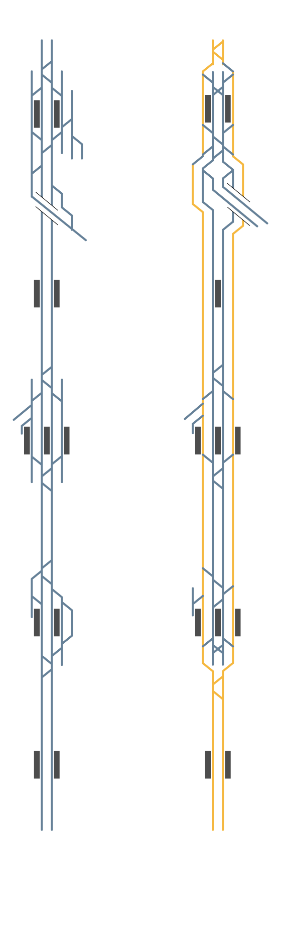 The project envisioned connecting the sections between stations in Castelldefels, Gavà, Viladecans, and El Prat with four tracks instead of two (see diagram). Regional and semi-direct trains, which make fewer stops, would use the outer tracks, while the two inner tracks would be for commuter trains, which stop at every station. The work would focus on extending the outer tracks—which currently only exist within the stations—along the entire section. "This would allow regional trains to overtake commuter trains, which make frequent stops, travel more slowly, and are often delayed," explains Comajoan. "If the regional trains didn't have to be at the back, they could shorten their journey times by about five minutes," he continues.