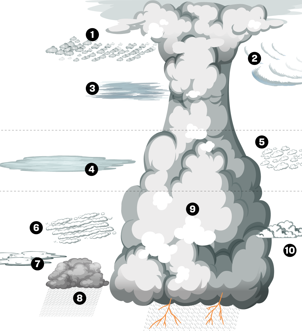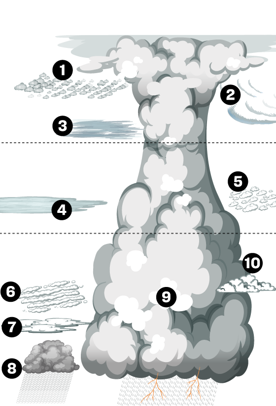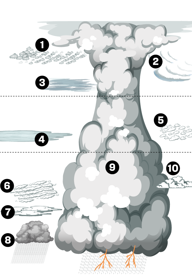 Probablement, els més famosos dels núvols. Són els més alts i produeixen pluges torrencials, trons, llamps o pedregades. Sovint, la seva part més alta s’estén com el barret d’un bolet.